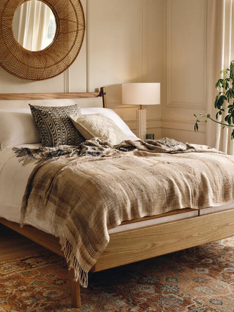 Interior designer peti lau painted this accent wall a deep marine hue and then brightened it up with a marigold bench and matching wall art.